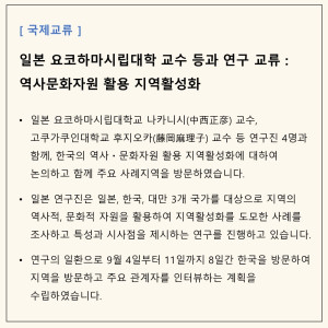 일본 요코하마시립대학 교수 등과 연구 교류: 역사문화자원 활용 지역활성화(수원시, 전주시, 서울시 등)